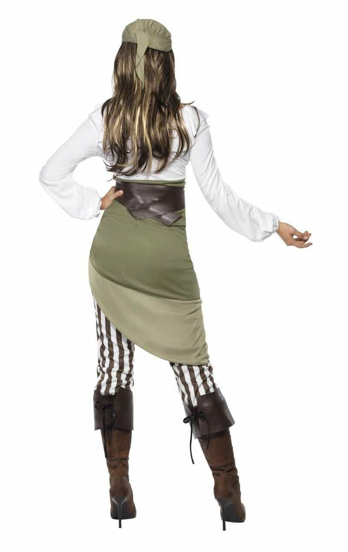 The Womens Shipmate Sweetie Pirate Costume includes a cream long sleeved top with a ruched neckline and a high waisted olive green skirt.