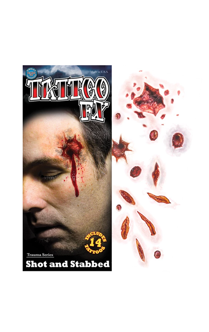 Show off your wounds this Halloween with these Shot and Stabbed Temporary Tattoos! Just add fake blood!