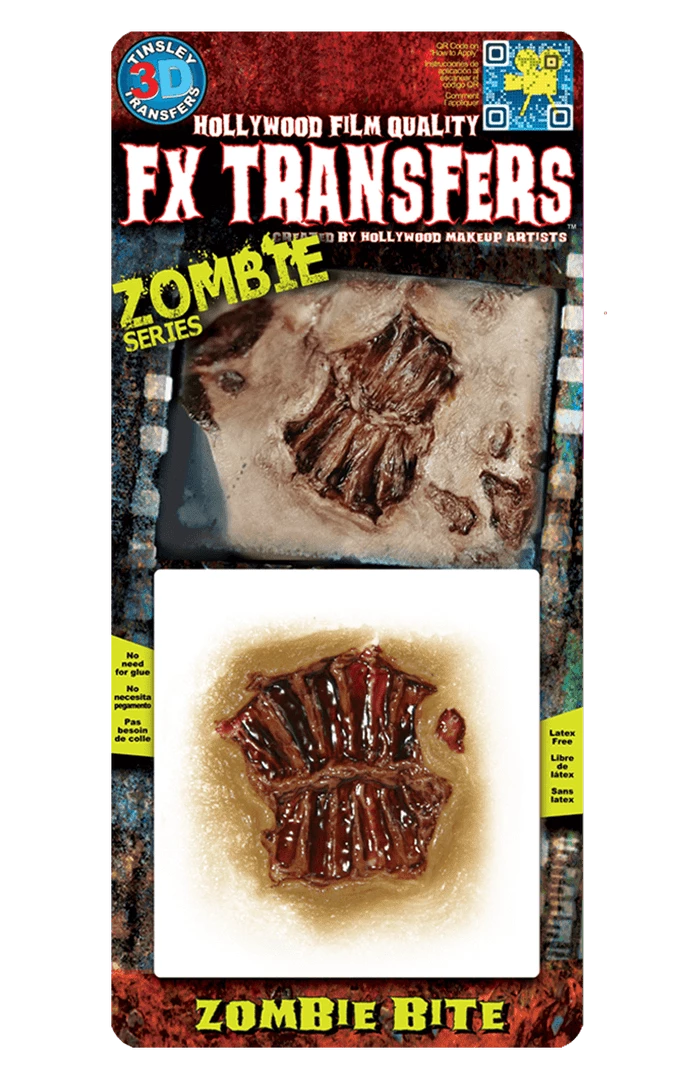 WARNING the pandemic is spreading and this Zombie Bite Transfer will transform you into the next victim of the flesh rotting virus this Halloween. Gauranteed to scare and horrify fellow party goers this clever transfer tattoo has been created by leaders in special effects makeup and is super easy to use. All you need is a little water to apply and the transfer adheres to the skin and lasts all day and night. So start perfecting your zombie walk now because there are brains to eat!