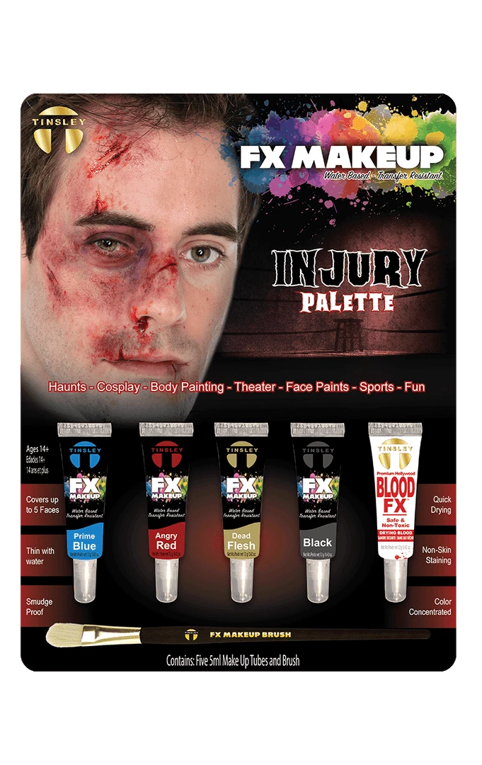 Create the ultimate battered, bruised and injured face this Halloween with our Injury Palette FX Makeup Kit. It has all the colours you need to create that horror victim look and comes complete with fake blood for a dramatic finishing effect.