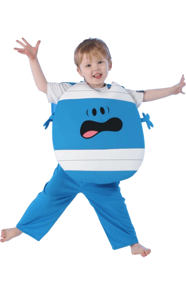 The Childrens Mr Men Mr Bump Costume includes a blue and white tabard with a worried face printed on the front and attached waving arms.
